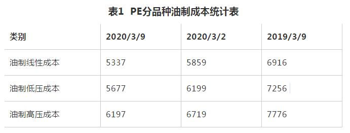受原油暴跌影响,油制PE生产成本明显下降。据隆众统计截止3月9日,油制PE线性成本在5337元/吨,油制PE低压成本在5677元/吨,油制PE高压成本在6197元/吨。