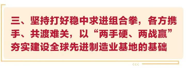 建设全球先进制造业基地,是一项光荣而艰巨的任务,是一项系统工程。要以干在实处、走在前列、勇立潮头的姿态和作为,最大限度地凝聚起各方力量,埋头苦干、克难攻坚、狠抓落实,努力把宏伟蓝图加快转化为美好现实。