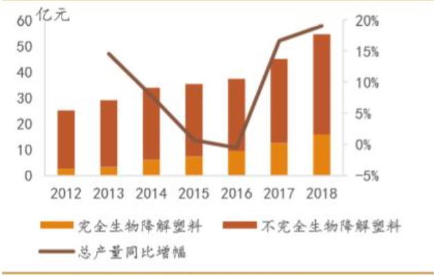 我国是全球唯一可以生产所有生物降解塑料产品的国家,近年来产能扩张迅速。2018 年我国生物降解塑料行业规模约 54.4 亿元,同比增长 21.1%。2018 年产量达 65 万吨,同 比增长 10.2%,其中完全生物降解塑料产量约 9.5 万吨,破坏性生物降解塑料产量约 55.5 万吨。