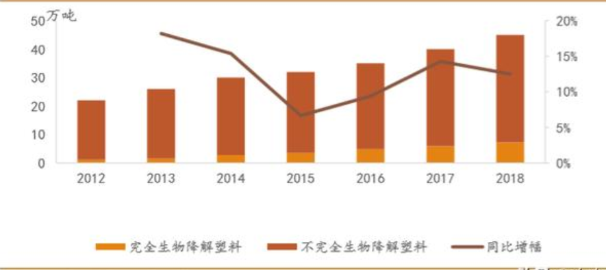 尽管如此,2012-2018 年我国生物降解塑料的需求量从22万吨增长至45万吨,年均复合增长12.7%,依旧处于快速增长。未来随着国内对于环保重视程度提高、《禁塑令》出台颁布,可降解材料的发展前景值得期待。