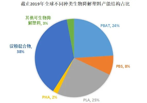 根据智研咨询发布的数据,截至2019年,全球生物降解塑料年产能为107.7 万吨。其中PLA(聚乳酸)为26.9万吨,占比25%;PBAT(聚己二酸/对苯二甲酸丁二醇酯)为25.85万吨,占比24%;淀粉基降解塑料为40.93万吨,占全球生物降解塑料产能的38%。