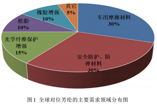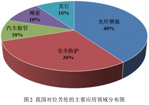 对位芳纶大分子链中的酰胺基团和对位苯基相连接,常见的是聚对苯二甲酰对苯二胺纤维。苯环与酰胺基团的共轭效应决定了对位芳纶高强度、高模量的优异性能,其密度仅是钢丝的五分之一,但拉伸强度却是钢丝的5~6倍,适用于制作轮胎子午线及增强其他橡胶制品。同时对位芳纶具有优异的耐磨性、耐切割性和防弹性能,被广泛应用于防弹安全防护、摩擦材料替代等领域。全球对位芳纶的需求领域分布图见图1,主要集中在车用摩擦材料、安全防护、防弹材料、保护增强光学纤维、轮胎、橡胶增强等领域。我国对位芳纶的主要应用领域是光纤增强、安全防护,再就是汽车胶管、绳索等(见图2)。