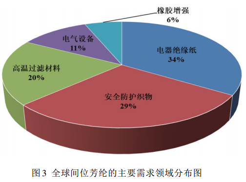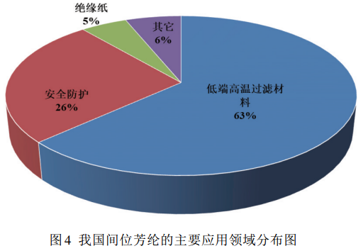 间位芳纶分子链中的酰胺基团和间位的苯基相连,主要代表是聚间苯二甲酰间苯二胺。与对位芳纶相比,其分子链酰胺和苯环键之间没有共轭效应,内旋转位能较低,链段柔性相对较好,结晶度较低,所以其模量低、伸长率高,作为织物的手感和舒适性更好。间位芳纶具有优异的阻燃性、耐高温、绝缘性和化学稳定性,广泛用于防火材料、高温传送带、高温过滤材料、高温防护织物、电气绝缘隔热等领域。全球间位芳纶的需求领域分布图见图3,主要分布在电气绝缘纸、安全防护织物、高温过滤材料、电气设备和橡胶增强等领域。我国间位芳纶主要用在相对低端的高温过滤材料领域,其次才是安全防护和绝缘纸领域(见图4)。与国际市场相比,我国制造的间位芳纶性能仍有很大的提升空间。