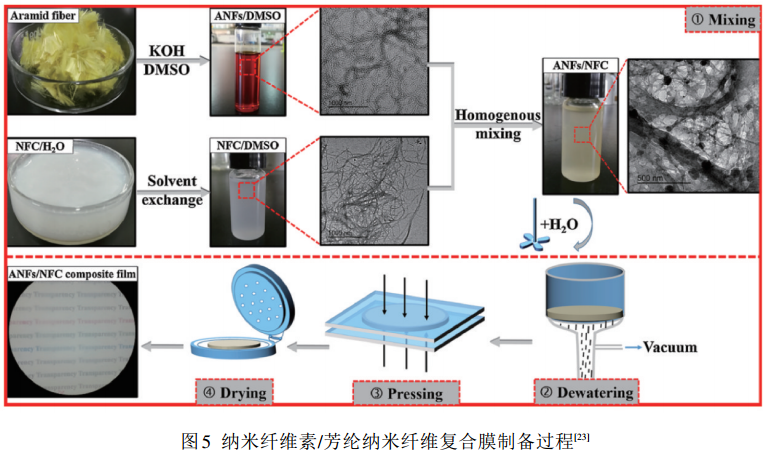 2011年,美国密歇根大学的YANG等用KOH/DMSO溶剂体系处理聚对苯二甲酰对苯二胺纤维,去除纤维表面酰胺基团上的氢,得到了芳纶纳米纤维(ANF)。该纤维兼具了聚合物纳米纤维和芳纶的优势,可有效解决芳纶表面光滑、活性较低、复合效果不好的问题。利用该方法,张美云课题组先后制备了力学性能优异且具有多功能的芳纶纳米纤维膜、芳纶纳米纤维增强对位芳纶复合纸、纳米纤维素/芳纶纳米纤维复合膜等 (见图5),拓展了复合材料的应用领域。目前芳纶纳米纤维正在实验室开发阶段,存在制备浓度较低、周期较长、机制不够清晰等问题,需要进一步研究。
