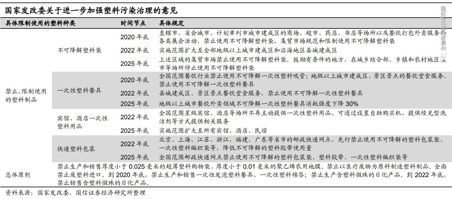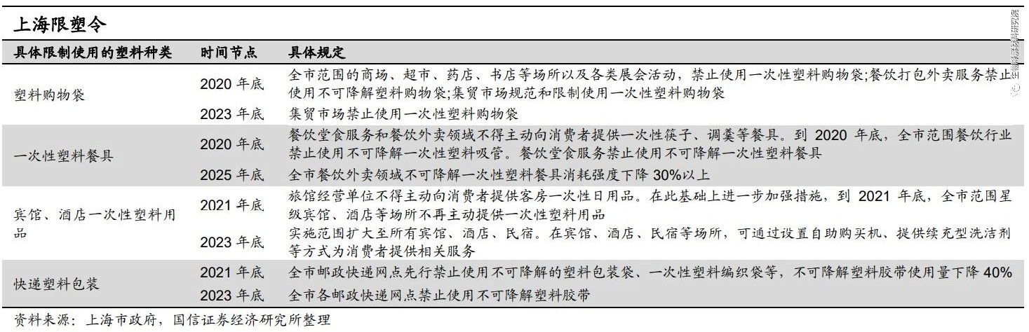 上海市要求从2020 年底开始,全市范围内的一些重点场所就陆续不得使用一次性用品,且具体规定了多个逐步推进的时间节点。最晚到 2025 年底,全市范围内的重点行业全部不得使用不可降解的一次性用品。整体上看,上海市在塑料污染治理方面走在前列,执行力度超过国家发改委在2020年初推出的政策。