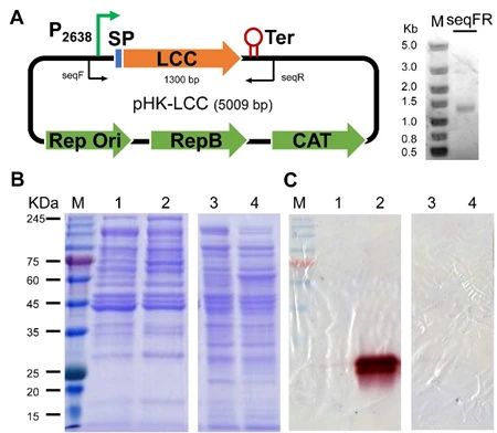 图1 PET降解嗜热全菌催化剂的构建及LCC活性分析