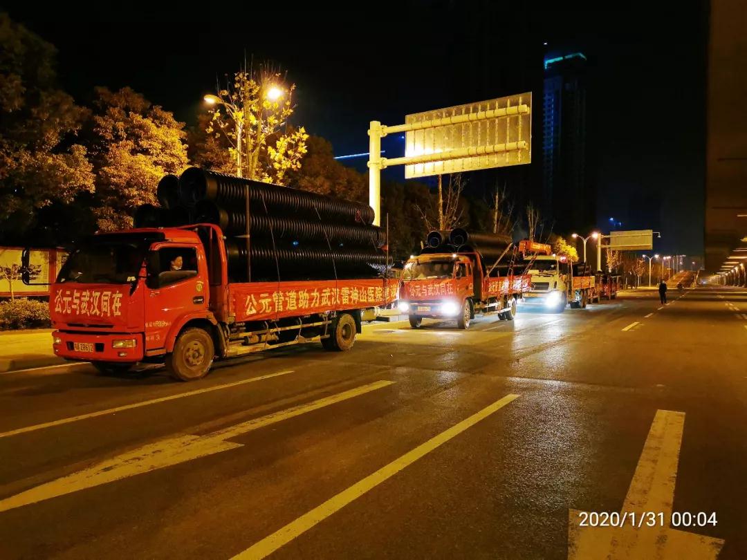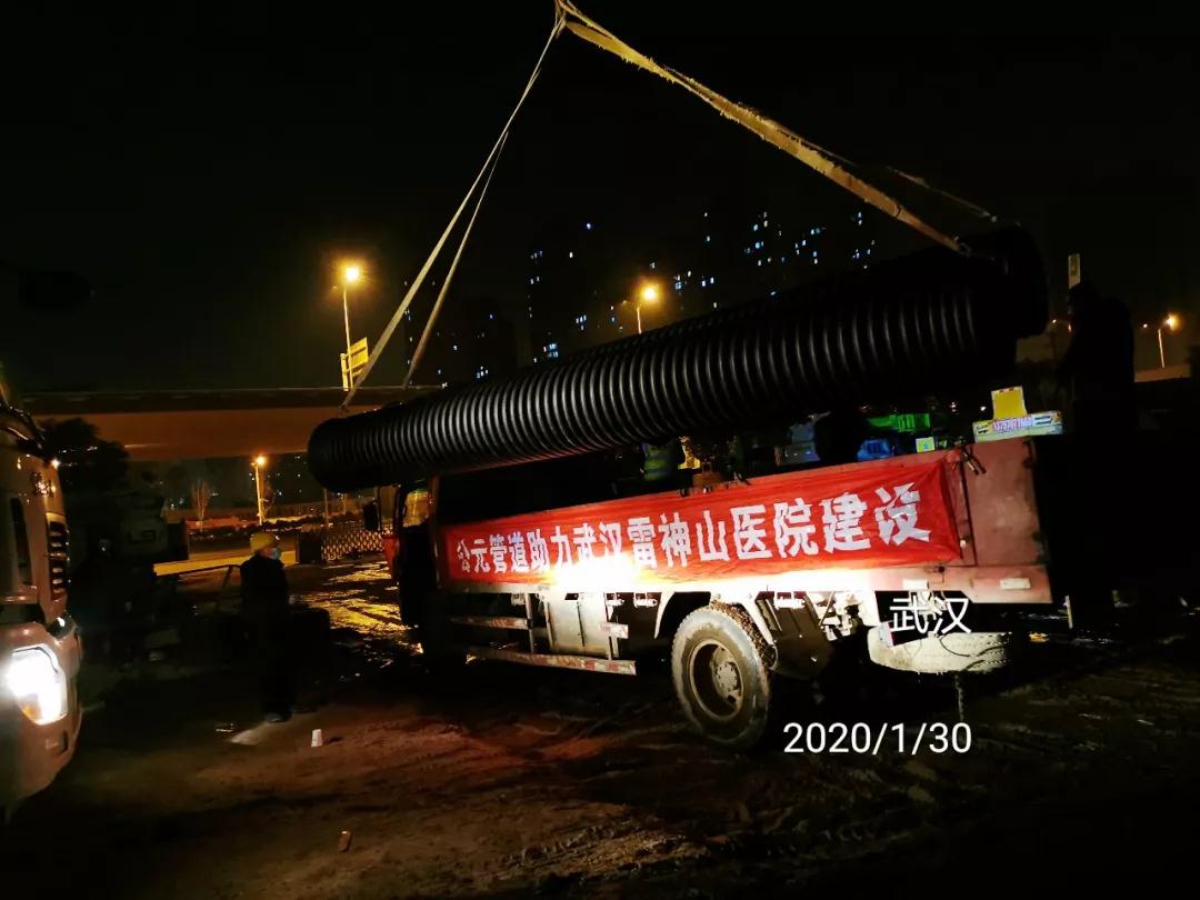 疫情面前,速度就是生命。公元集团·永高股份时刻关注院区建设,积极响应,随时待命,全力驰援,助力院区早日建成。自27日第一批捐赠管道运抵雷神山建设现场后,31日凌晨,第二批捐赠的PE双壁波纹管再次运抵,投入院区建设中。