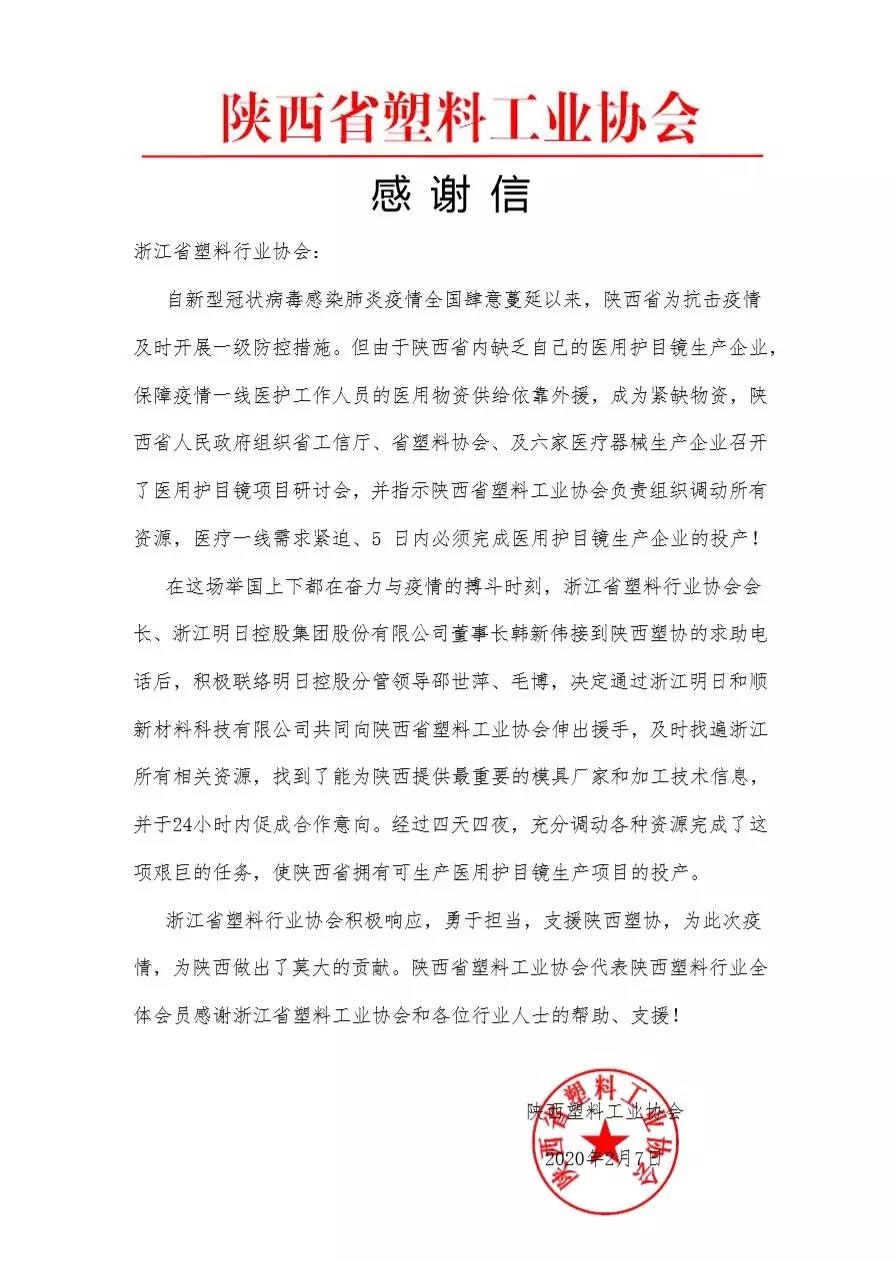 这意味着浙江塑协及会长单位明日控股助力陕西省医用护目镜生产企业终于顺利投产,