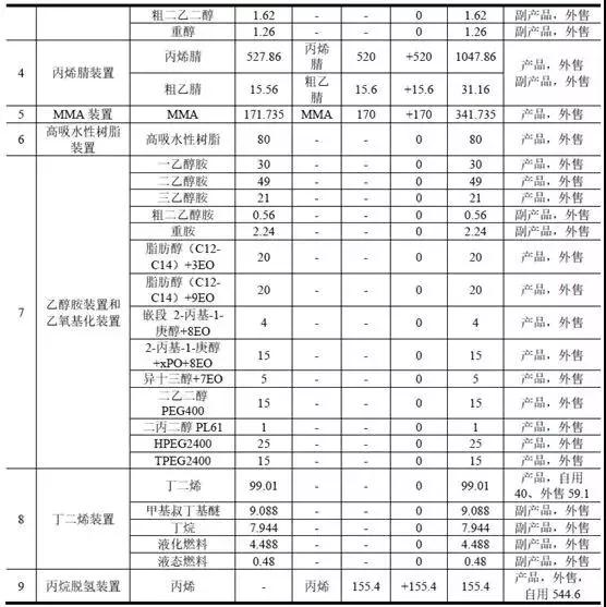 项目建成后,全厂将具有年产22.7万吨乙二醇(环氧乙烷20万吨,乙二醇2.7 万吨)、30万吨EVA树脂、80万吨乙烯/丙烯(甲醇法)、8万吨高吸水性树脂、10万吨乙醇胺、12万吨乙氧基化、10万吨丁二烯、70万吨丙烯(PDH)、2.76万吨/年纯氢、1.56万吨乙腈、104 万吨丙烯腈、35万吨MMA及55万吨废酸再生(SAR)的生产能力。