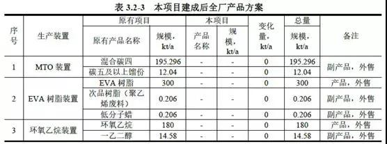 一期启动240万t/a甲醇进料制烯烃装置(即80万t/a烯烃装置)、环氧乙烷装置(规模 20万 t/a,乙二醇规模2.7万t/a)、 300kt/a EVA树脂装置(一条20万t/a管式生产线,一条 10万t/a釜式生产线)、26万t/a丙烯腈装置、8万t/a MMA 装置等主体及配套公用工程、辅助设施建。装置等主体及配套公用工程、辅助设施建。