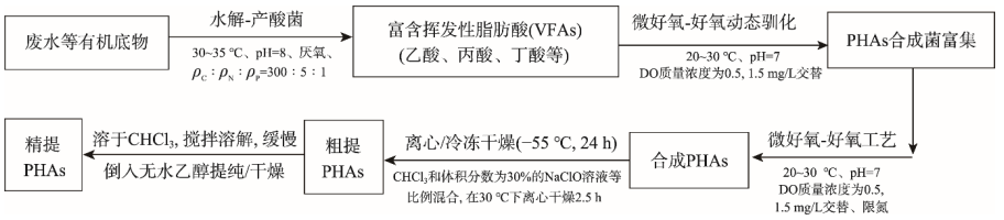 目前,PHAs 未实现大规模工业化生产主要归因于其生产成本高和产量低。文中分析得可通过控制 PHAs 的合成工艺(微好氧-好氧或好氧瞬时供料法)和合成因素(底物种类、pH 值、C/N 值、温度和 DO 质量浓度)来解决存在的问题,其生产成本控制和产量提升是今后可降解材料领域的研究热点。