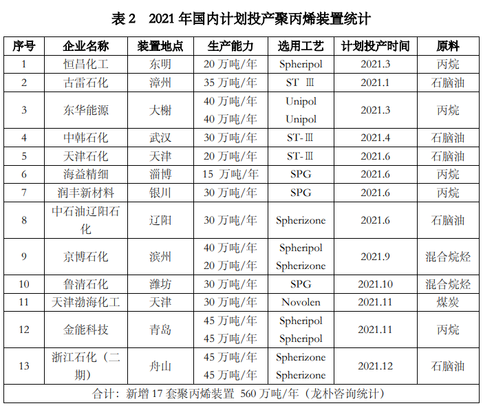 2021年内已经投产5套聚丙烯装置,合计增加规模140万吨/年,具体如下: