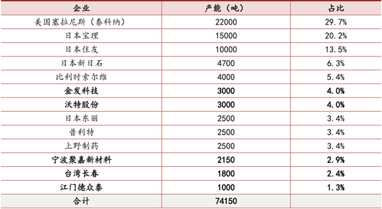 液晶聚合物(以下简称LCP)是一种主链上含有大量刚性苯环结构的芳香族聚酯类材料,具有低吸湿性,耐高温、耐辐射、耐水解、耐候性、耐腐蚀、天然阻燃性、低热膨胀率、高抗冲击性、高刚度以及吸振性能等特点。上游:芳香族聚酯类、芳香族酚、芳香族二酸产品:热致性液晶TLCP、溶致性液晶LLCP目前,全球液晶聚合物产能约为7.8万吨/年,集中分布在美国、日本和中国。其中,美国和日本企业约占全球总产能的80%左右,中国仅占20%左右。海外主要生产企业包括塞拉尼斯、宝理、住友、索尔维、东丽等,其中,塞拉尼斯和宝理各占美日产能的一半以上,行业集中度较高。我国进入LCP领域较晚,随着近年多个项目陆续投产,LCP产能快速增长,至2020年国内LCP产能达到1.8万吨/年。主要生产企业包括沃特股份、金发科技、普利特、聚嘉新材料,沃特股份为中国最大的LCP生产企业,总产能将达到8000吨/年,占全国总产能的45%左右。