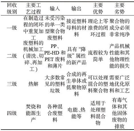 物理法(一级、二级回收)和化学法(三级、四级回收)的优势及劣势见下表。