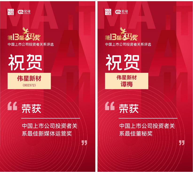 浙江伟星新型建材股份有限公司(以下简称伟星新材)再次荣获中国上市公司“最佳投资者关系奖”“投资者关系最佳董事会奖”“投资者关系最佳新媒体运营奖”,公司董秘谭梅女士荣获主板上市公司“投资者关系最佳董秘”。