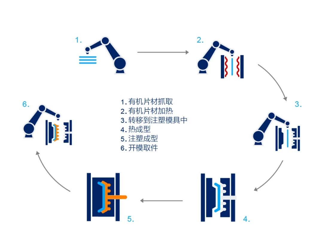 5) 注射成型:完成复杂结构件的成型,并将塑胶熔体与已经预成型的片材进行复合;