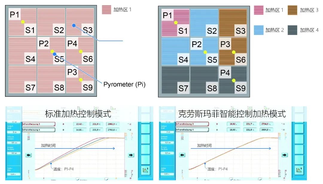 右半部为更加智能化的加热控制模式,同样的区域S1-S9被分成了4个区域即Zone1-Zone4,并通过4种不同的颜色来表示;同样在每个区域中会有相对应的温度传感器P1-P4与之匹配;在这里4个区域配合各自的温度传感器通过软件控制有相互的通讯,当片材被置入红外加热站后,4个区域独立且相互通讯保证配合,最终从右下部的曲线中可以看到片材在不同区域的加热速率保持一致,并且在一定的加热时间内有相统一的匀热时间。片材在不同位置上温度的一致性是保证成型与产品品质均一的前提条件之一。