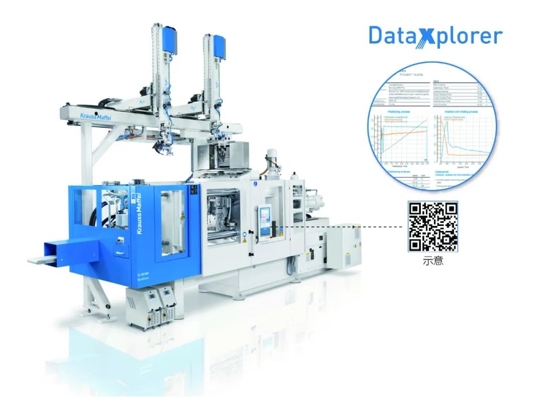 而针对需要进行可追溯性要求的部件,设备需搭载DataXplorer数字化解决方案;图4为克劳斯玛菲KM300-1400CX并搭载塑料4.0 - DataXplorer模块来完成产品的追溯性需求。DataXplorer针对注射成型过程中的微观细节参数进行采集,保证了数据的完整与有效性;外围设备易于添加;开放的系统保证了它易于连接MES系统与未来可能用到的平台。最终用户通过手机等移动终端扫描上文中第7步打印的二维码,并可以获取更详细的分析和文件。这一切将保证通过将生产数据进行连续不断的可视化来保证其高度透明,简化故障排除和生产加工诊断,同时它也是先进分析方法的基础。