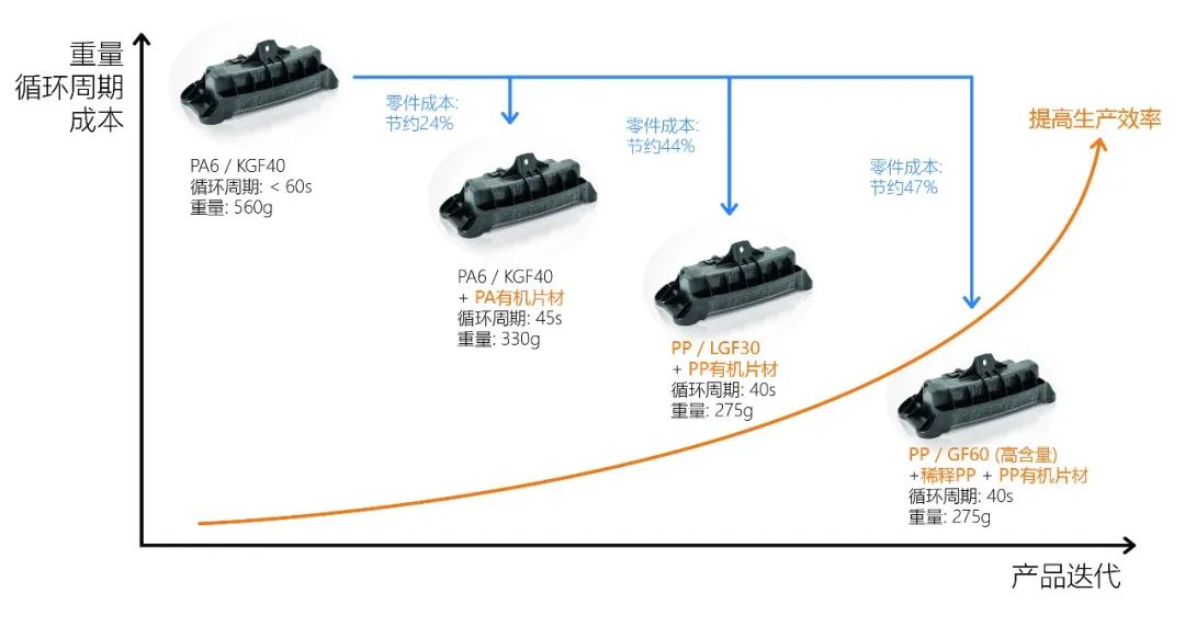 图3展示了汽车安全气囊罩壳产品的研发历程。通过高强度工程材料的应用,并结合克劳斯玛菲先进的FiberForm技术,使产品的成本得到大幅控制。相较于最初的注射成型相比,得益于对原材料的再设计以及有机纤维复合材料的高强度,使得产品重量降低接近50%;同时成型周期由原本的大约60s降低到现有大约40s; 最终使得生产效率显著提升。