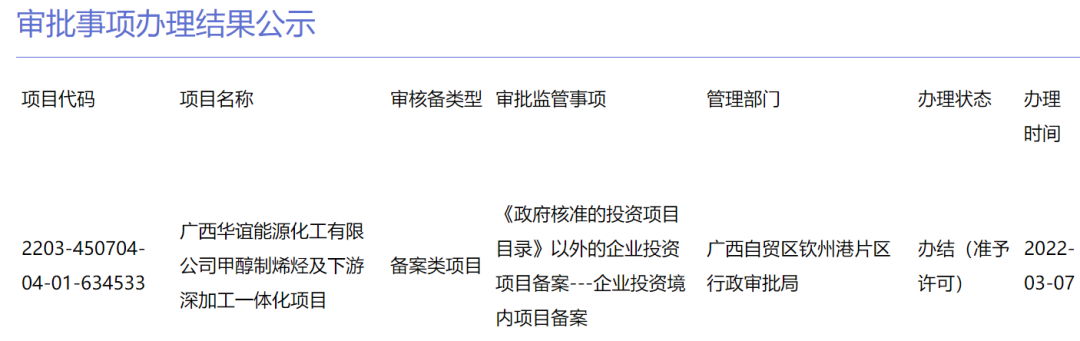5月5日,广西印发2022年第二批自治区层面统筹推进重大项目方案的通知。在公布的200个预备预备重大项目中,华谊集团一口气上了8个石化项目。其中甲醇制烯烃及下游深加工一体化项目尤为引人注目。
