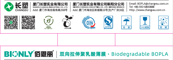 其中,有一款新型生物基可降解膜材引起了我们的注意。这款产品的背后正是今年2月凭借着持续创新的研发能力获得“国家企业技术中心”的厦门长塑实业有限公司(以下简称“长塑实业”)。目前长塑实业旗下的新型生物基可降解膜材(BOPLA)BiONLY®佰恩丽®已成功取得国家权威认证机构的生物降解认证证书,并实际应用于产品。