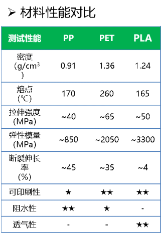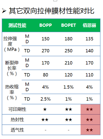郑伟:说到佰恩丽®的具体性能,这个得从三个维度来具体对比。从材料之间来看,PLA介于PP和PET之间,弹性模量高;与其他双向拉伸膜的对比,佰恩丽®的拉伸强度接近BOPP,且拥有优异的印刷性能、热封性能以及透气性能;与普通吹膜可降解膜对比,其拉伸强度和光学性能则远远超出。所以对比传统的塑料薄膜,佰恩丽®还兼顾了减碳减塑,是未来包装领域的理想膜材。