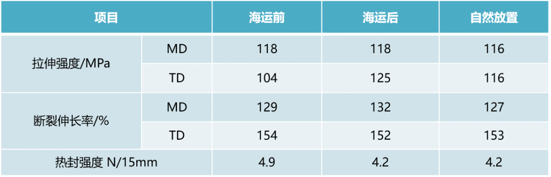 郑伟:我们可以直接通过海运运输及老化实验两项测试,看看佰恩丽®是否能满足存储运输的需求,方便客户的实际应用。通过下面海运图,大家可以直观地看到当卷膜通过海运运输的方式,途径新加坡、苏伊士运河、希腊,最终到达比利时,穿越赤道,接受高温高湿的洗礼,通过前后的物理性能对比,其基础物性性能变化不大,薄膜外观无明显变化且不会粘结。