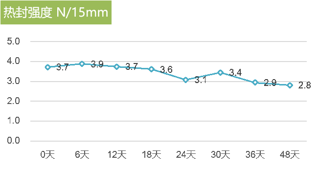 通过实验模拟2年的老化测试(25μm BOPLA薄膜 试验条件:基准:23℃/60%RH 老化条件:45℃/85%RH,加速因子:15.1),可以看出在正常的避光防潮条件下,其拉伸强度和热封强度下降幅度不明显。