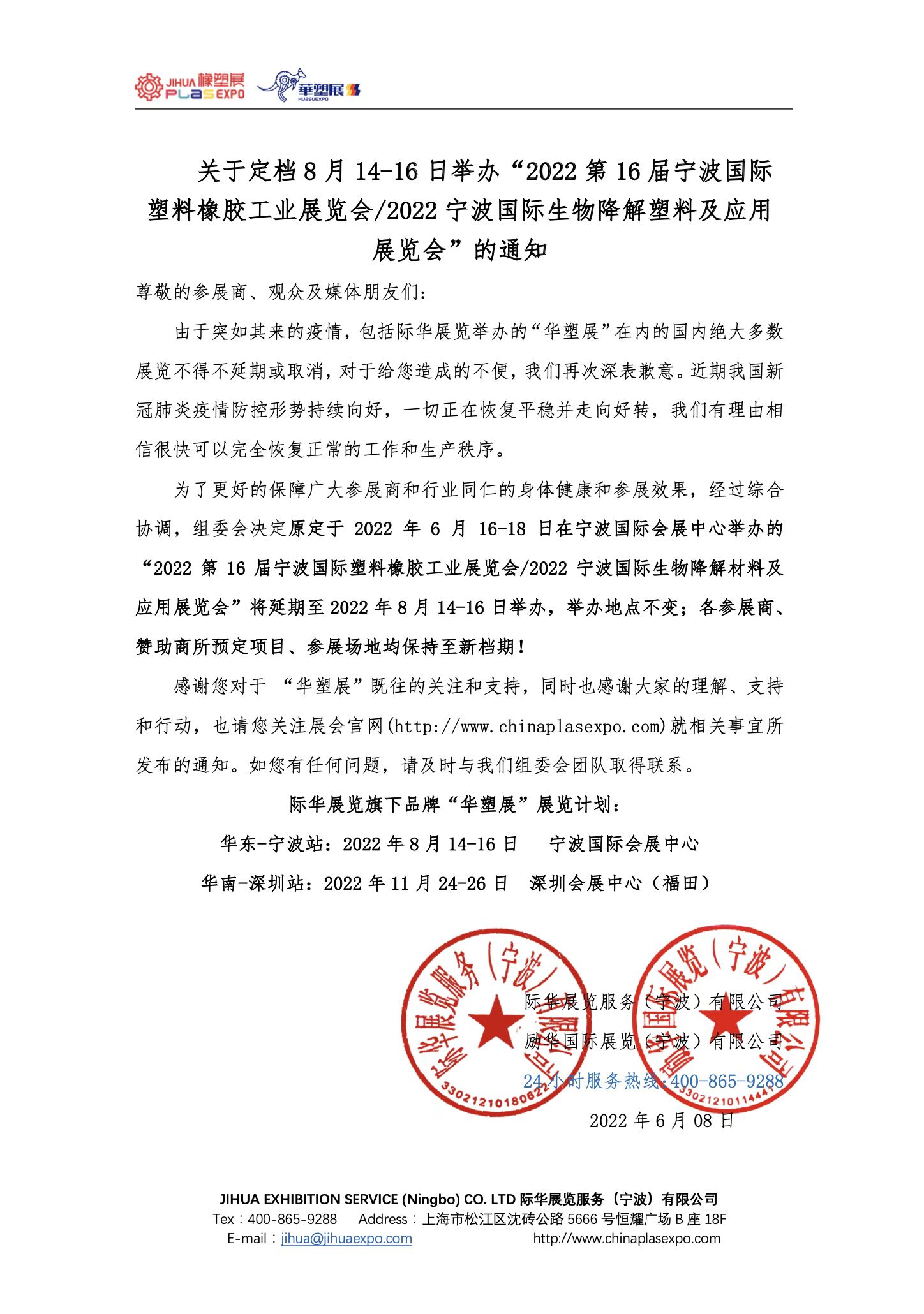 关于定档8月14-16日举办“2022第16届宁波国际塑料橡胶工业展览会/2022宁波国际生物降解塑料及应用展览会”