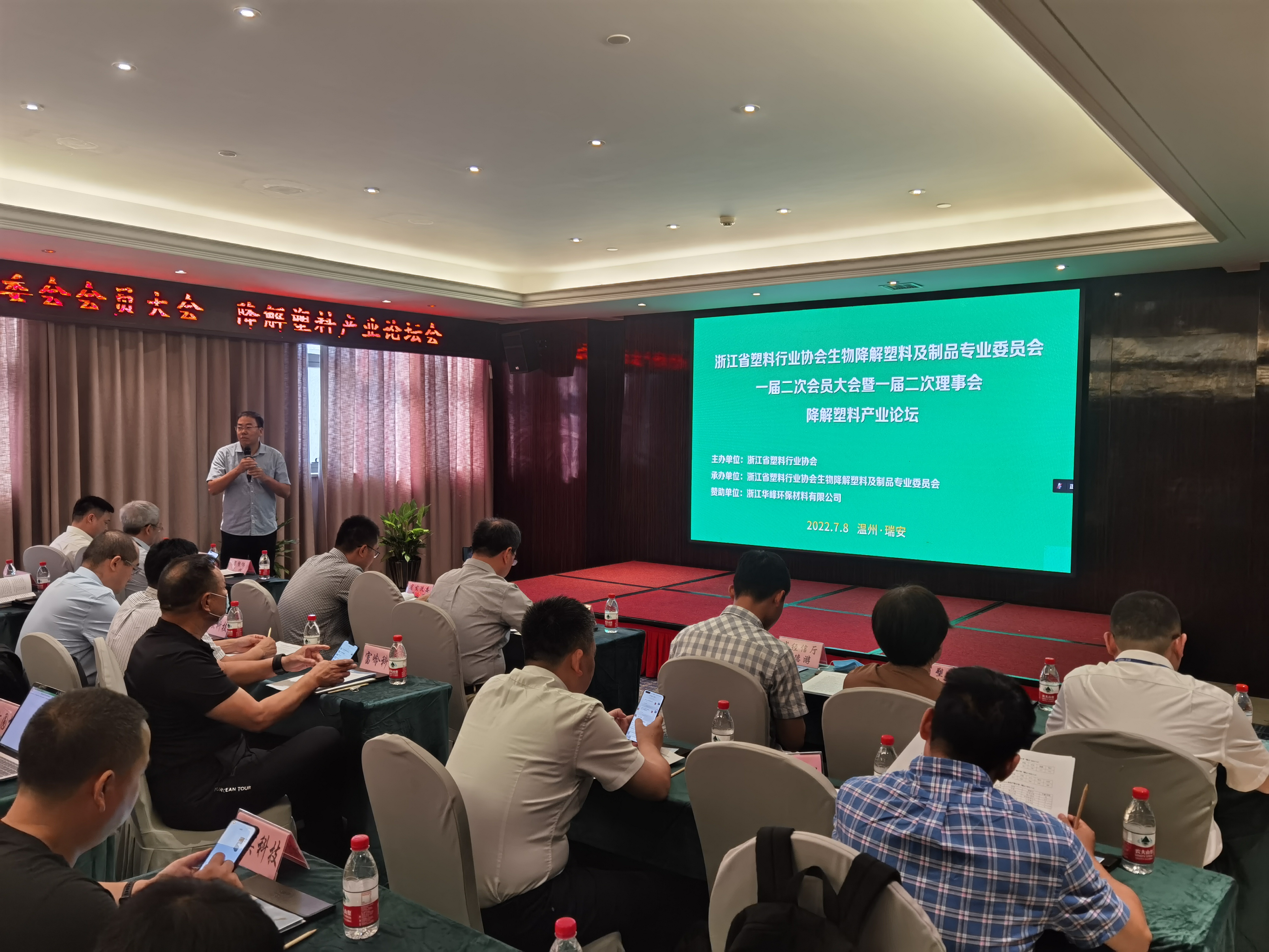 7月8日,由浙江省塑料行业协会主办、浙江省塑料行业协会生物降解塑料及制品专业委员会承办、浙江华峰环保材料有限公司赞助的“浙江省塑料行业协会生物降解塑料及制品专业委员会一届二次会员大会暨一届二次理事会、降解塑料产业论坛”在温州瑞安顺利召开。浙江省发展和改革委员会、浙江省经济和信息化厅、浙江省市场监督管理局等政府部门领导应邀出席会议,浙江省塑料行业协会会长王旭、副会长兼秘书长汪建萍、专委会主任委员单位、副主任委员单位、理事单位及会员单位的70余位代表参加会议。