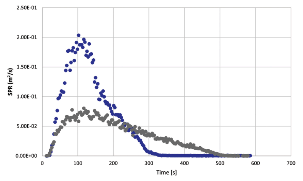 图2 典型的PVC配方(蓝色)和含等效用量Reagens NT8004 FR的配方(灰色)的ISO 5660烟雾产生速度对比(资料来源:Reagens)