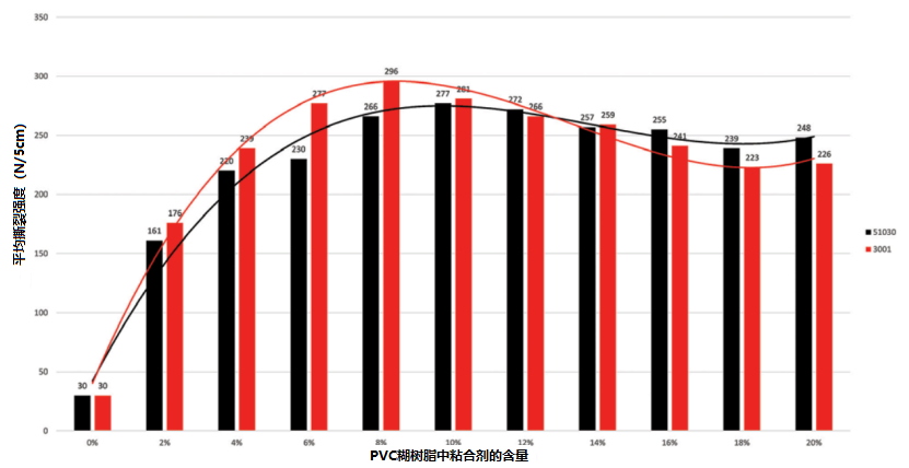 图4 通过剥离实验测量朗盛的新型无邻苯二甲酸盐粘合剂3001的性能,测试结果与其现有的51030牌号对比。在PVC糊树脂配方中的添加量为0-20%不等(资料来源:朗盛)