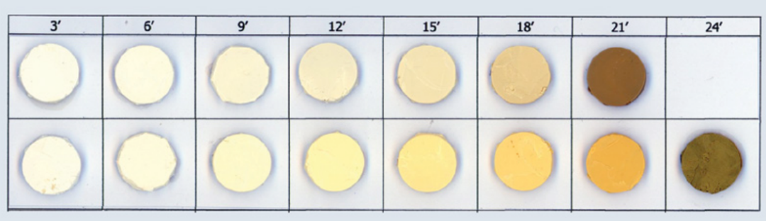 图3 在布拉本达 Plasti-corder(箱内温度180°,转子速度50 rpm,样品重65 g)中进行的动态热稳定性测试,比较含有1份锡稳定剂+0.7份REAPAK B-NT/7222促进剂(上面一排)的配方和3.5份Reapak Tu/1900 CoS稳定剂的配方。样本上的数字是时间(分钟)(资料来源:Reagens)