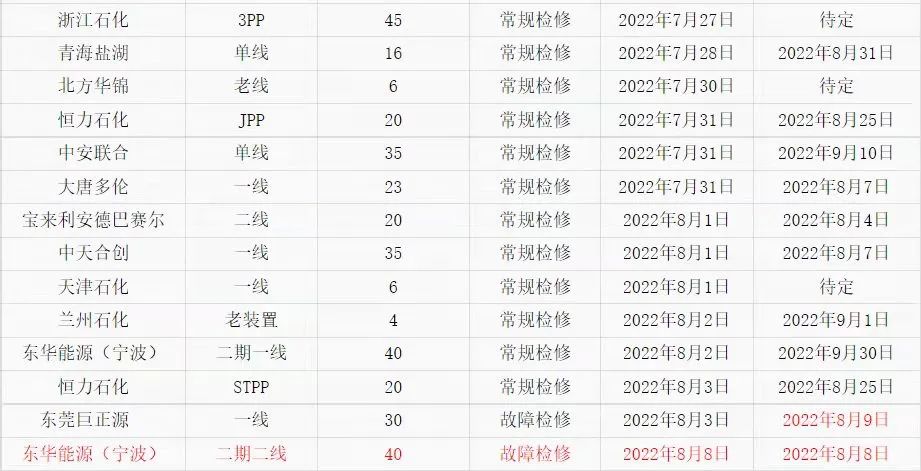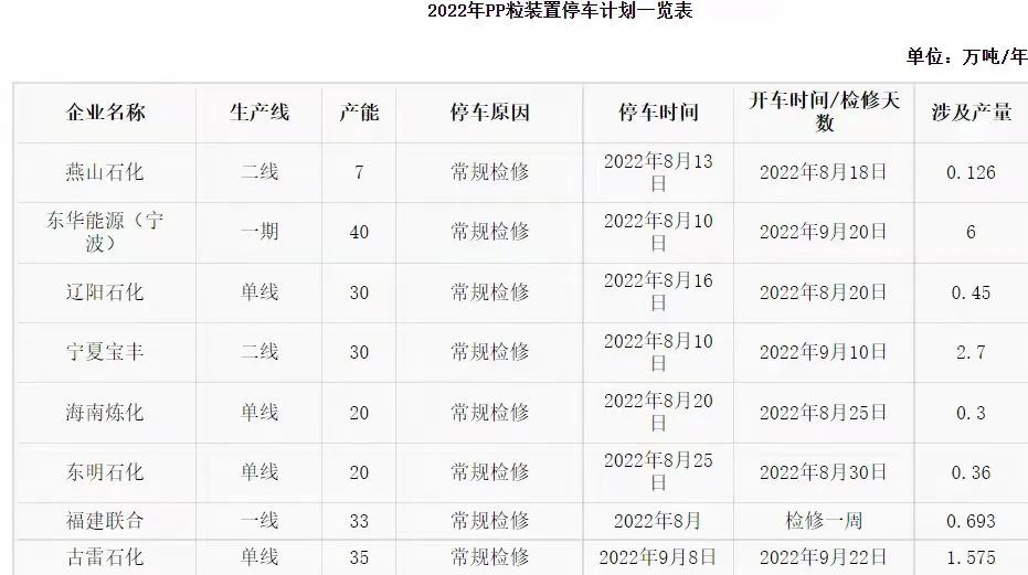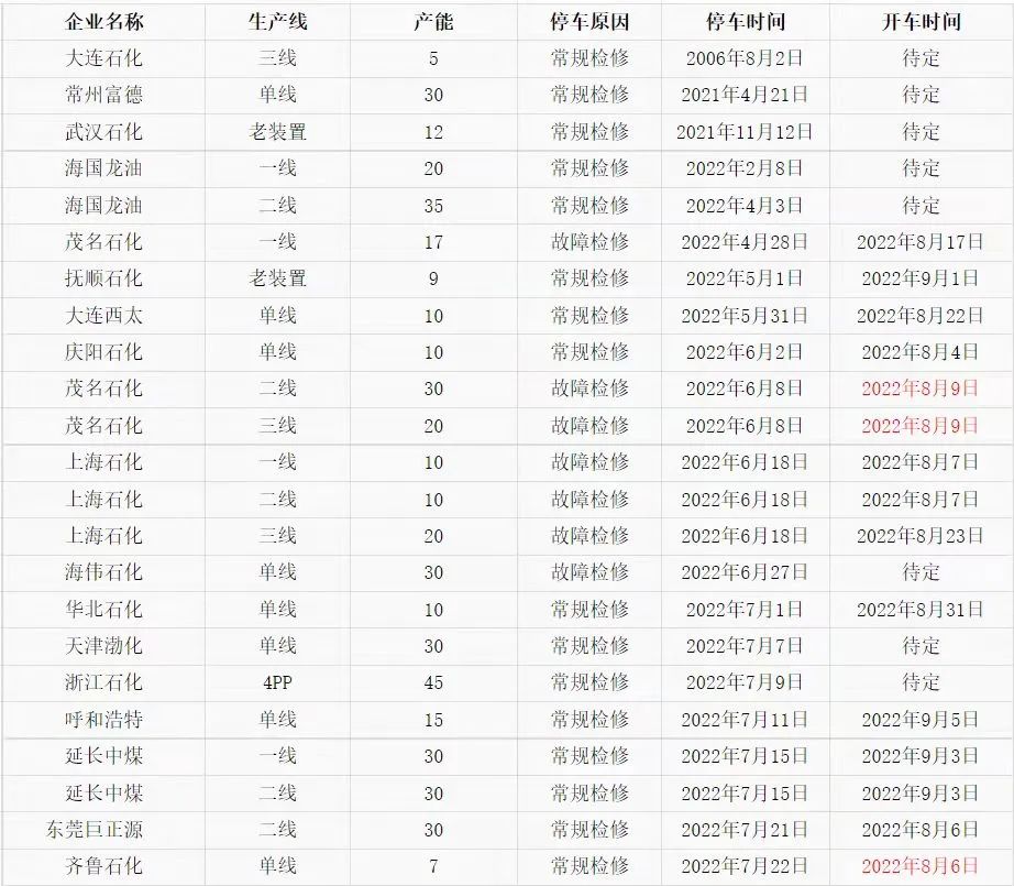 今日国内聚丙烯停车装置检修生产线共计29条,共涉及产能660万吨。上海石化一线(10万吨/年)PP装置8月7日重启,上海石化二线(10万吨/年)PP装置8月7日重启;东莞巨正源二线(30万吨/年)PP装置8月6日重启;齐鲁石化(7万吨/年)PP装置8月6日重启;大唐多伦一线(23万吨/年)PP装置8月7日重启;中天合创一线(35万吨/年)PP装置8月7日重启;东华能源(宁波)二期二线(40万吨/年)PP装置今日停车检修。