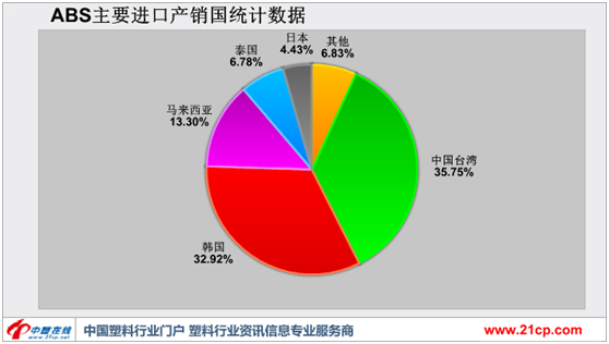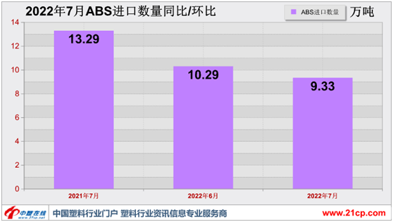 由上图可见,2022年7月的进口量与2021年7月进口量相比,同比减少3.96万吨,减幅29.80%,与2022年6月进口量相比,环比减少0.96万吨,减幅9.33%。以上进口数据打破了近年来ABS进口数据的新低,可见国内ABS市场已经处于格局变更之中。