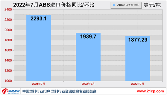 2022年7月ABS进口均价1877.29美元/吨,同比下跌415.81美元/吨,跌幅18.13%;环比下跌62.41美元/吨,跌幅3.22%。