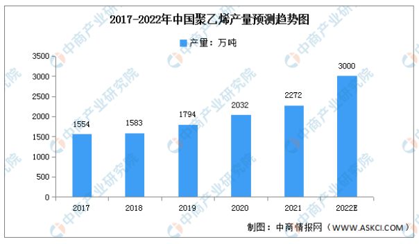 我国聚乙烯产能的利用率较高,常年维持在90%左右,随着我国经济的发展,聚乙烯市场需求增长迅速,产量也随之提高。近年来,中国聚乙烯产能及产量一直保持增长趋势,中国聚乙烯产量约为2272万吨,同比增长11.8%,产量将超过3000万吨。
