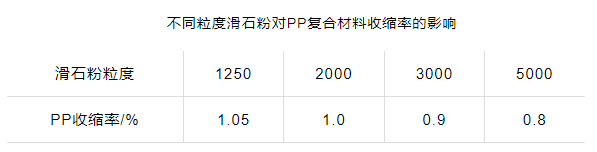 同一种填料的粒度不同,对收缩率的影响效果也不同,粒度越小对收缩率的降低幅度就越大。以滑石粉填充PP (20%滑石粉+8%POE)为例,不同粒度滑石粉对收缩率的影响如下。