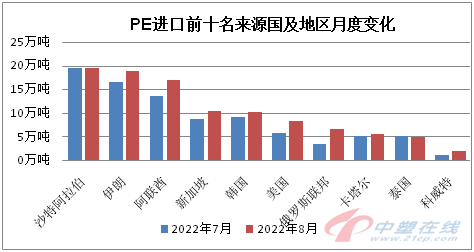 2022年8月聚乙烯进口来源国前十位占比位次稍有变动,科威特挤进前十,其他微幅调整。沙特阿拉伯仍居第一,进口总量为19.44万吨,环比减少0.83%,占比16.68%;伊朗第二位,进口总量为18.89万吨,环比增加13.81%,占比16.21%;第三位为阿联酋,进口总量为17.1万吨,环比增加26.20%,占比14.67%。四到十位分别是新加坡、韩国、美国、俄罗斯联邦、卡特尔、泰国和科威特。