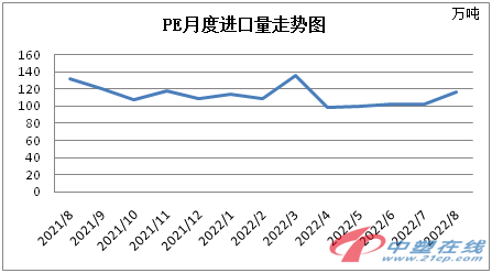 出口方面,统计数据显示,2022年8月聚乙烯出口量约5.72万吨,环比减少33.18%,同比增加11.26%。具体分到产品,LDPE出口约1.86万吨,环比减少13.49%,同比增加26.83%;HDPE出口约2.11万吨,环比减少42.35%,同比减少21.29%;LLDPE出口约1.74万吨,环比减少36.73%,同比增加75.08%。1-8月累计出口量为49.38万吨,环比减少33.18%,这也进一步验证了海外需求的走弱,出口量逐渐减少。