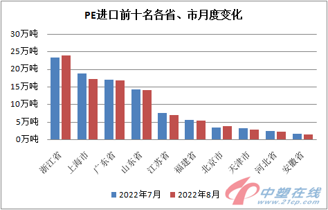 8月,我国进口聚乙烯按注册地统计,第一名依然是浙江省,进口量23.85万吨,占比20.47%;上海市第二,进口量为17.24万吨,占比14.79%;广东省第三,进口量为16.71万吨,占比14.34%;山东省第四,进口量为13.99万吨,占比12.01%;山东省、江苏省、福建省、北京市、天津市、河北省以及安徽省分列第四至十位。