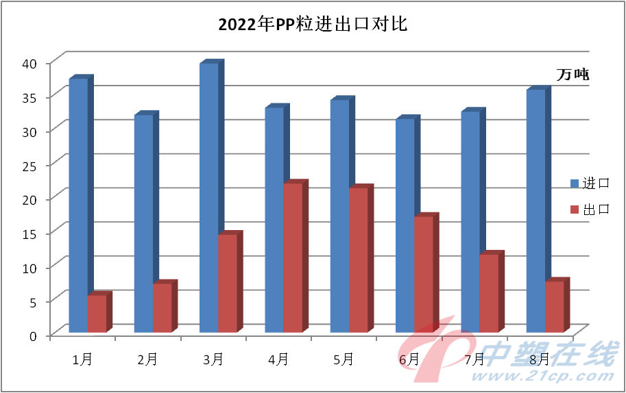 据海关数据,8月份我国PP出口量创5个月以来新低,环比大幅下降34.82%至7.45万吨;进口量持续小碎步增长趋势,环比回升9.87%至35.61万吨。