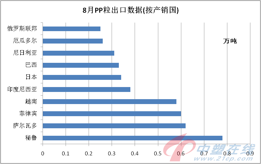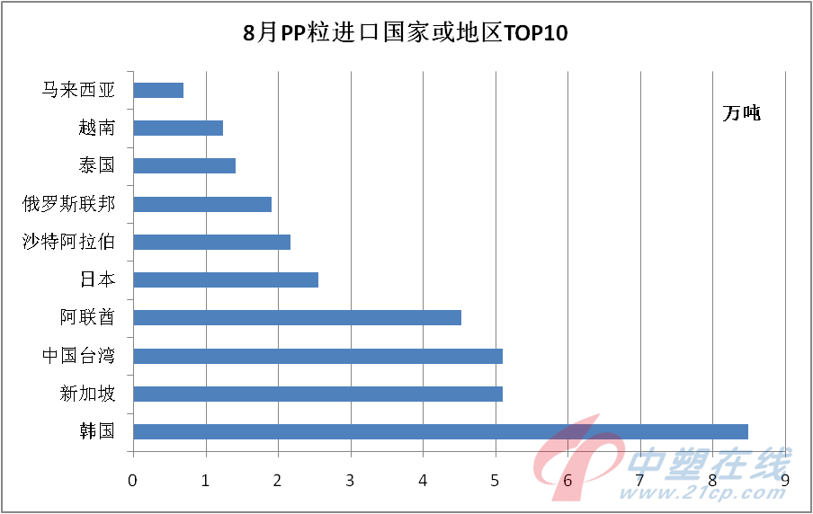 8月份初级形状的PP进口为22.64万吨,环比增长6.09%,同比减少21.44%;乙烯-丙烯聚合物进口量为11.63万吨,环比增长21.78%,同比增长1.39%;其他初级形状的丙烯共聚物进口量为1.34万吨,环比减少11.84%,同比减少6.29%。主要受疫情、高温天气影响,不少省市地区停产或限产,对国内生产、消费造成一定阻碍,当月PMI环比仅升0.4个百分点,国内需求释放不及预期的现状,令国内进口恢复难有太大进展。