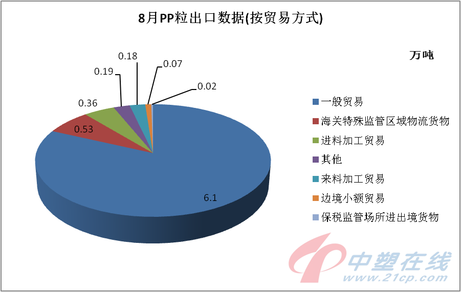 PP出口贸易方式有:一般贸易、海关特殊监管区域物流货物、进料/来料加工贸易及边境小额贸易等,其中一般贸易方式占比81.88%,环比减少3.62万吨;海关特殊监管区域物流货物减少0.17万吨,占总出口量的7.11;进料加工贸易略减0.02万吨,占总出口量的4.83%。