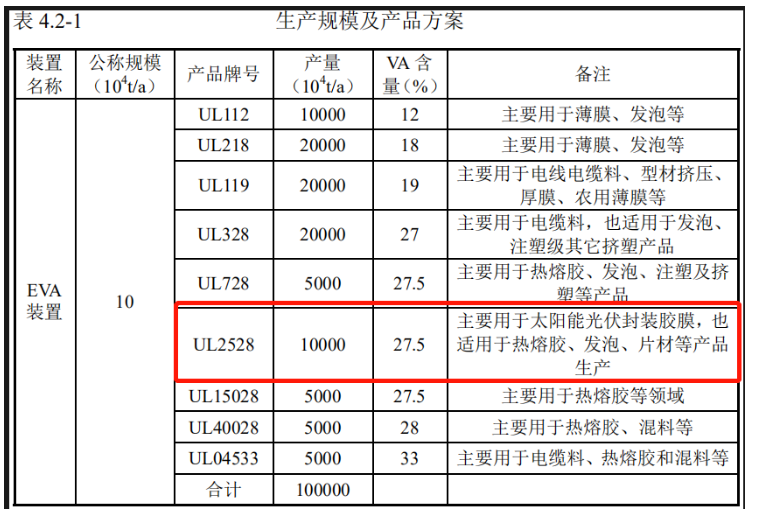 该项目共生产 9 个牌号的 EVA 产品,其中牌号UL2528产品可用于生产光伏料,产能为1万吨/年,其VA含量为27.5%。