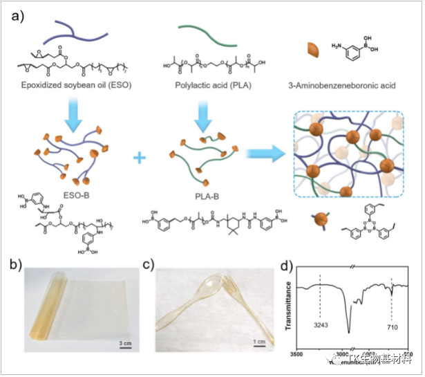 首先,通过化学反应合成了苯硼酸接枝的ESO(记为ESO-B)和线性苯硼酸封端的PLA(表示为PLA-B),ESO-B和PLA-B与环硼氧烷交联以制备具有改善机械性能的超分子塑料,同时FTIR表明ESO-PLA塑料与环硼氧烷交联。厚度约为50µm的ESO-PLA塑料透明且柔韧。此外,ESO-PLA聚合物可以通过使用不同形状的模具溶液加工成塑料餐具,如叉子和勺子(图 2)。