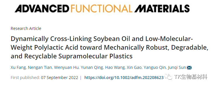 相关研究成果以“Dynamically Cross-Linking Soybean Oil and Low-Molecular-Weight Polylactic Acid toward Mechanically Robust, Degradable, and Recyclable Supramolecular Plastics”为题于2022年9月7日发表在《Adv. Funct. Mater.》上。