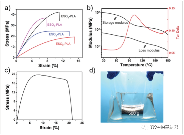 ESO-PLA塑料即使在高度潮湿的环境中也表现出足够高的机械强度,可用于日常使用。此外,厚度约为70µm的湿ESO-PLA塑料袋足够坚固,可容纳300mL水和500g的重量,表明塑料具有良好的耐水性和力学性能。