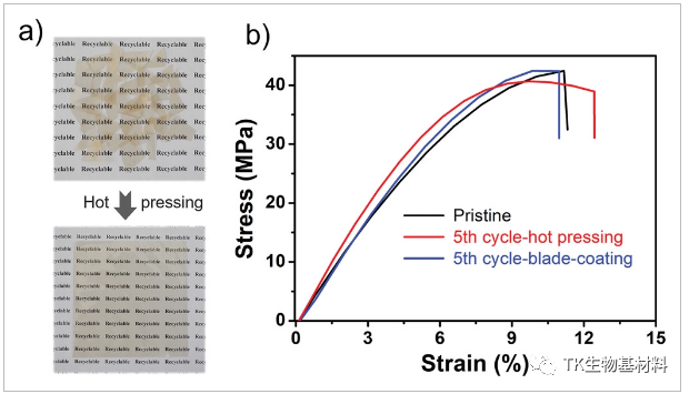 为了大幅度减少原材料消耗,必须赋予ESO4-PLA塑料具有高效的可回收性。由于环硼氧烷在乙醇存在或加热下具有高可逆性,这种塑料可以多次回收以恢复其形状完整性和原始机械强度。如图5所示,将塑料切成小块,通过在4 MPa 压力下进行10分钟的热压工艺,这些塑料碎片可以重新成型为大面积和无缺陷的塑料片材。重要的是,回收制备的塑料几乎与原始塑料的力学性能相同,表明塑料具有优异的可回收性。