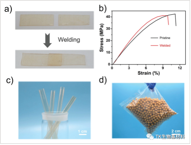 由于环硼氧烷的动态特性,塑料具有独特的焊接能力。如图4所示,将塑料条切成两半,然后将两半重叠并在100 °C和4 MPa的压力下热压,能够重新生成塑料条。拉伸试验表明焊接的塑料具有与原始塑料高度相似的机械性能。得益于优异的焊接能力,塑料可以方便地加工成各种形状的塑料制品,如塑料吸管。此外,塑料还可以简单地用热封机密封边缘来加工成塑料袋(图4)。
